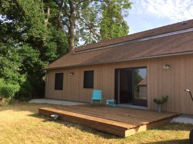 Maison ossature bois de plain-pied avec une baie vitrée donnant accès à une petite terrasse en bois.